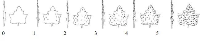 | Бал | Відсоток ураження пагонів та листя борошнистим нальотом, % |