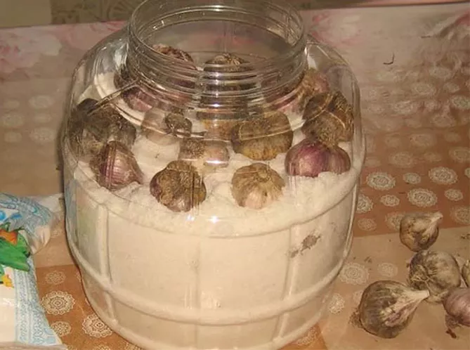 Один із поширених методів, що дозволяють розмістити цілий і розібраний на зубчики часник. Оскільки зберігати часник у банці можна у коморі, на балконі, у холодильнику або у буфеті, то залишається обрати наповнення: сіль, борошно, масло або взагалі без них.