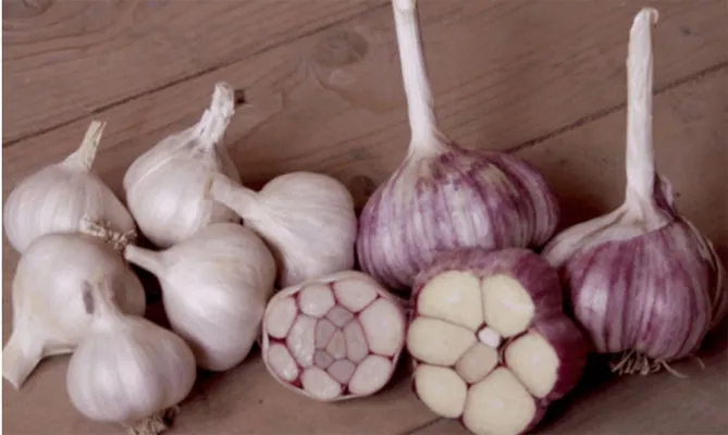На фото праворуч представлений у розрізі озимий, ліворуч – ярий часник. Різниця у наявності міцного стрижня, кількості, порядку розміщення зубчиків.