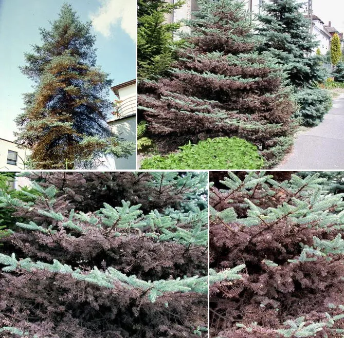 Найчастіше хвойні дерева уражає зелена ялинова попелиця. Вона живиться на нижній стороні голок (через що вона погано видна). Шкідники живляться великими кластерами, зазвичай на наймолодших приростах. У середині квітня з зимуючих яєць на пагонах дерева вилуплюються личинки, з яких утворюються безкрилі самиці. Вони дають початок новим колоніям і крилатим формам. Найбільшу чисельність колонії комах досягають наприкінці квітня – на початку травня. У сприятливих умовах можуть оволодіти всім деревом.