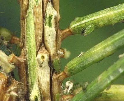 - сильно уражені рослини не ростуть, бобові погано зав'язують стручки.