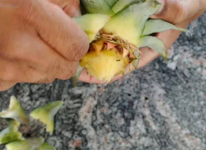 - Відкрутити корону. Ананас міцно фіксують однією рукою, іншою беруть чубок біля основи листя, повертають убік. Плід трохи відтягують, щоб операція пройшла швидше. Зазвичай, щоб корона відокремилася, достатньо чверті оберту. Пучок листя має сидіти на циліндричній волокнистій серцевині.