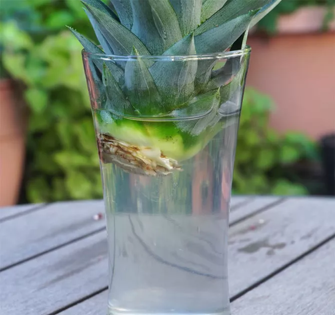 Верхівку ананаса ставлять на пророщування у тепле світле місце, але не під прямі промені сонця. Краще взяти прозору скляну посудину, на дно покласти пару таблеток активованого вугілля, налити чистої води.