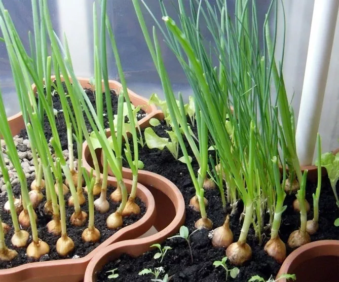 Перш ніж посадити цибулю на зелень на підвіконні, потрібно вибрати відповідний горщик і підготувати грунт. На дно обраної ємності засипається шар дренажу, потім – землесуміш. Цибуля краще росте у родючому, вологому ґрунті – нейтральному чи слабкокислому. Цибулю можна висаджувати з :