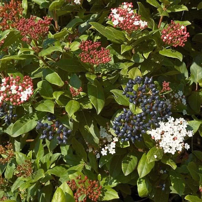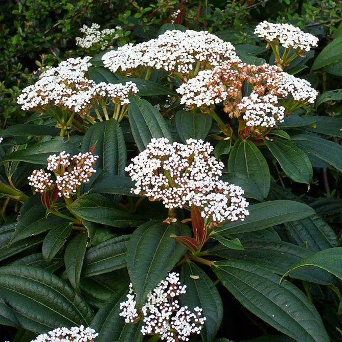 Що ж стосується вічнозелених видів, то вони дозволяють створити масив, який залишається зеленим навіть посеред зими! Наприклад, Viburnum tinus, Viburnum davidii, Viburnum x burkwoodii та Viburnum rhytidophyllum. Також дуже цікава чудова золотисто-жовта листва калини лантанової «Aureum»!
