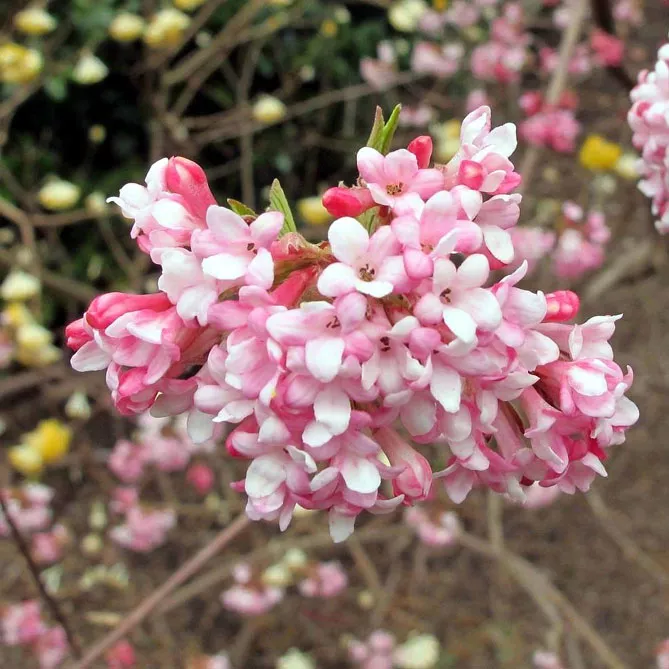 Сорт калини боднантенської «Даун» (Viburnum bodnantense Dawn) цвіте ранньою весною. Висота – 2,5 м. Голі гілочки навесні вкриваються димчастими, рожевими квітами. Кущ виглядає дуже ефектно, так як в цей час в саду не вистачає квітів інших рослин! Потім з'являється листя, спочатку бронзове або мідне в молодому віці, потім темно-зелене. Восени листя набуває красивих червоних відтінків.