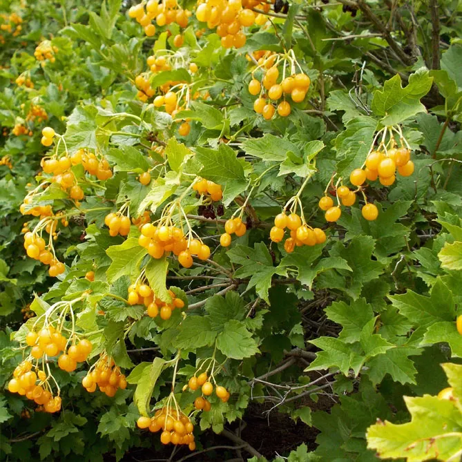 Жовтоплідний сорт калини звичайної «Ксантокарпум» (V. opulus Xanthocarpum) цвіте з травня по червень. Висота куща – 2 м. Весною кущ прикрашають білі квіти, восени листя набуває чудового пурпурного забарвлення. Її легко вирощувати.