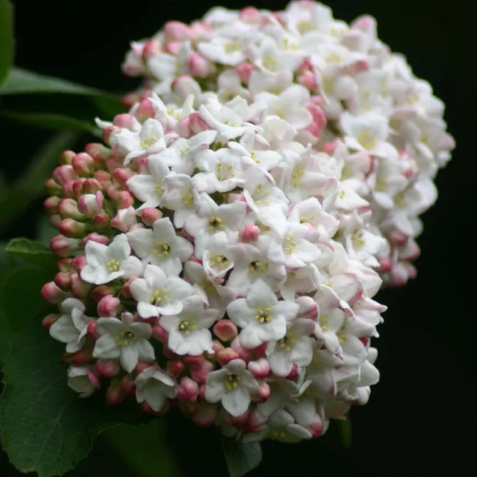 З кінця весни до червня цвіте Калина англійська (Viburnum (x) carlcephalum). Висота дорослого чагарника – 3 м. Сорт цікавий своїм дуже ароматним рожевувато-білим цвітінням! Листя восени набуває червоних відтінків. Сорт дає червоні ягоди, які при дозріванні стають чорними. Росте повільно, любить кислу почву.