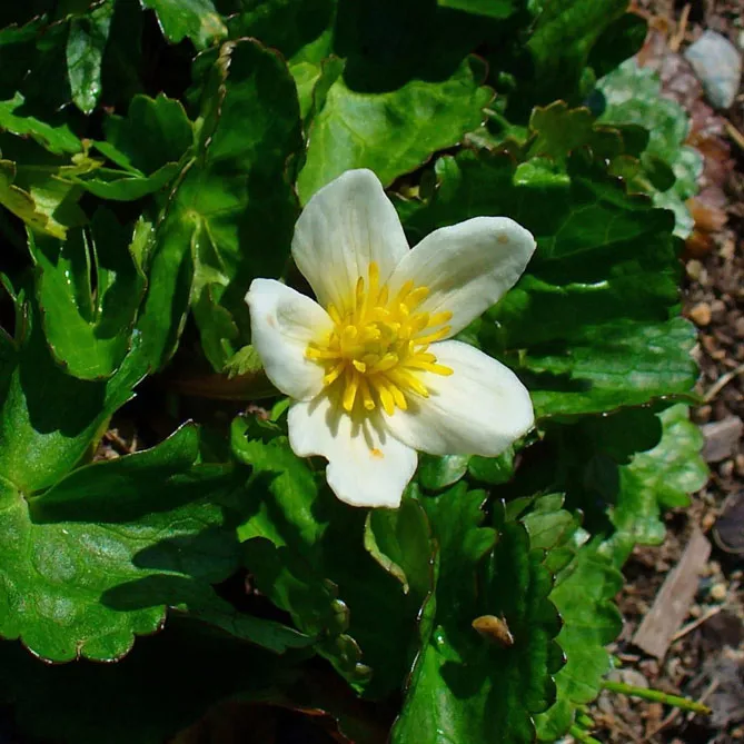 Калюжниця «Альба» (Caltha palustris var.alba) цвіте білими квітками з квітня по травень. Висота – 30 см. Це чудовий акцентний сорт, сповнений свіжості, ідеально підходить для прикрашання берегів водойми, наприклад, басейну, ставка, забезпечуючи перехід до решти частини саду.