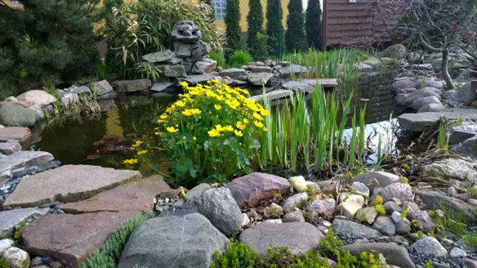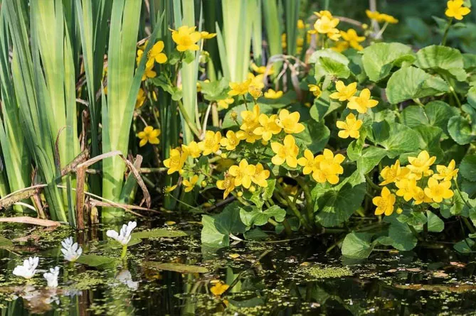 - доповніть композицію красивим кущем іриса болотного, ще однієї прибережної рослини, чиї жовті квіти забезпечать наступність квітів калюжниці;
