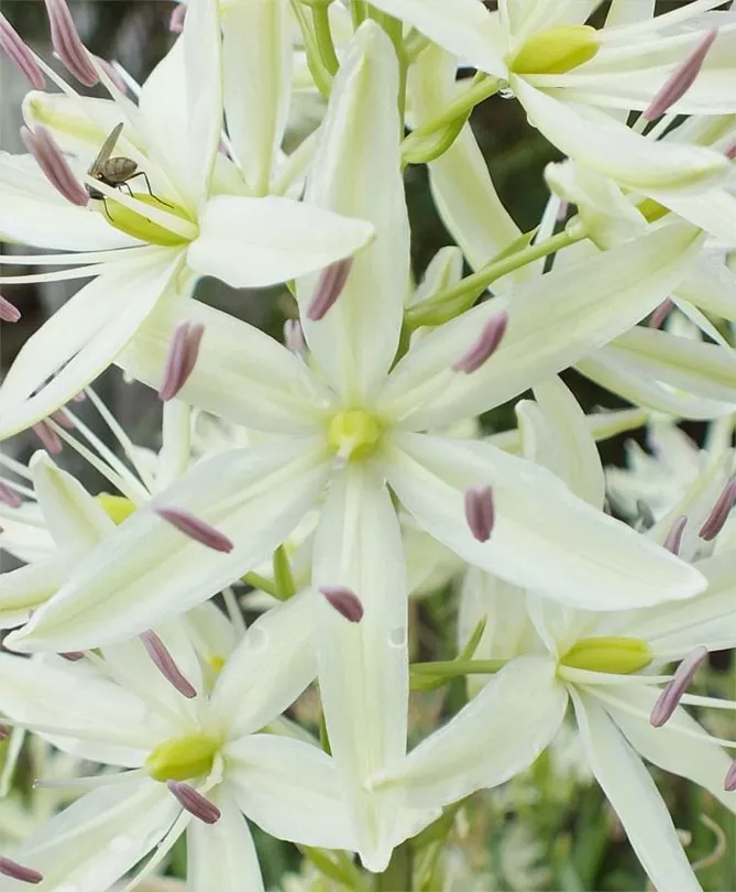 - Квіти. Рослина зазвичай цвіте у травні-червні. З листя виходить довгий міцний стебло, що досягає висоти до 1,3 м, його міцність дозволяє йому обходитися без підтримки. На верхівці розвивається ефектне суцвіття завдовжки 10-30 см, що складається з численних зірчастих квітів (діаметром 5-7 см). Вони з'являються поступово, знизу вгору, протягом 2 тижнів. Квіти розпускаються у красивій палітрі барв – від кольору слонової кістки до фіолетового, лазурно-блакитного, бузкового. З кожної зірчастої квітки виступають довгі, красиві жовті чи білі тичинки, створюючи гармонійний контраст.