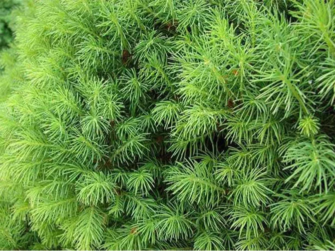 | Хвоя | Окремі гілки розташовані в мутовках, на них розташовані короткі, опуклі голки. Хвоя світло-зелена, завдовжки до 10 мм, щільно розташована навколо пагонів, м'яка, трохи колюча. У поперечному перерізі голки ромбоподібні, їх кінець гострий. Вони швидко опадають після висихання дерева. |