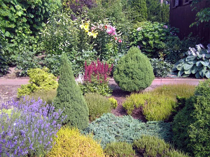 Ялини можна комбінувати з різними рослинами – низькими, ґрунтопокривними, переважно з контрастним листям.