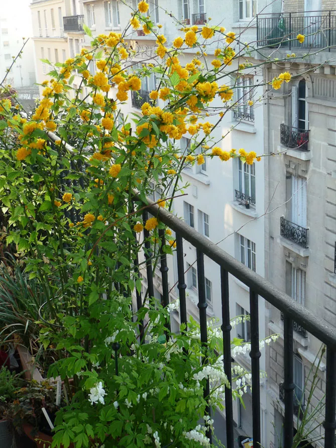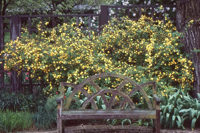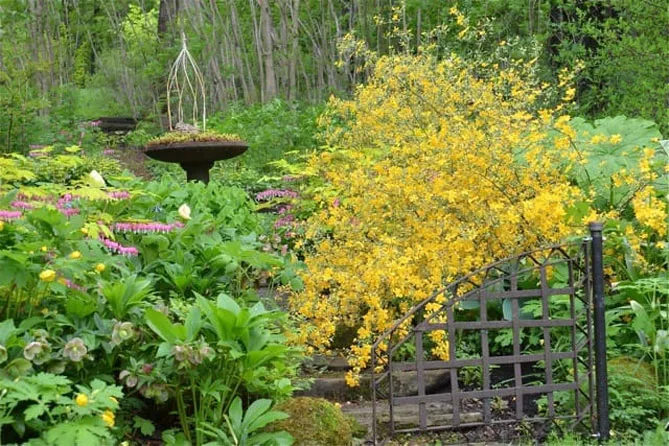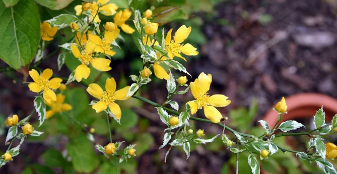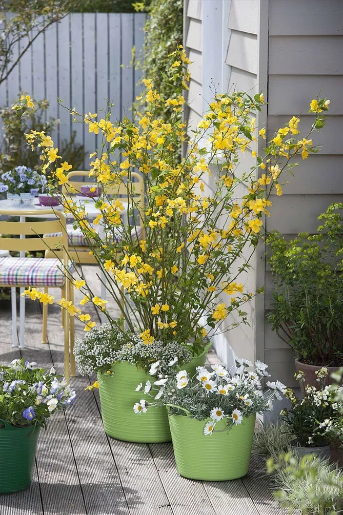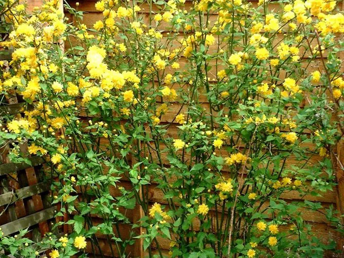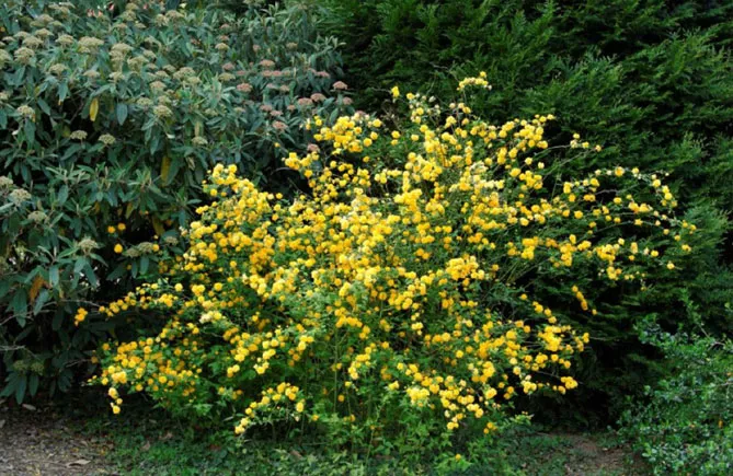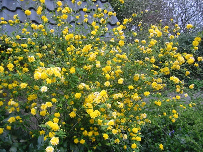 Гілки керії, всипані дрібними золотисто-жовтими квітками, послужать фоном для різних рослин: