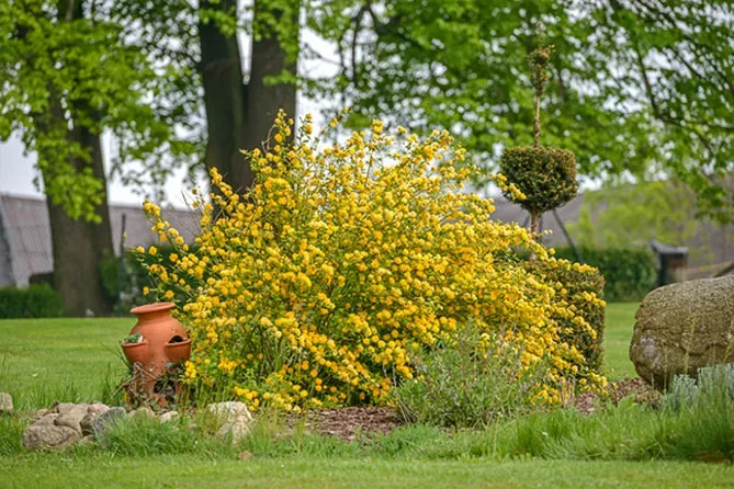 У квітучій живій огорожі керія стане ідеальним компаньйоном для кущів, що цвітуть раніше або пізніше, для подовження декору саду: