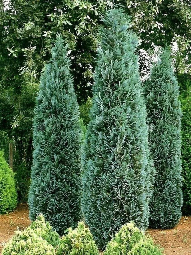 Сріблястий колір сорту «Колумнарис» Columnaris буде добре виглядати в барвистих композиціях з іншими хвойними деревами, наприклад, в компанії з іншими кипарисами: