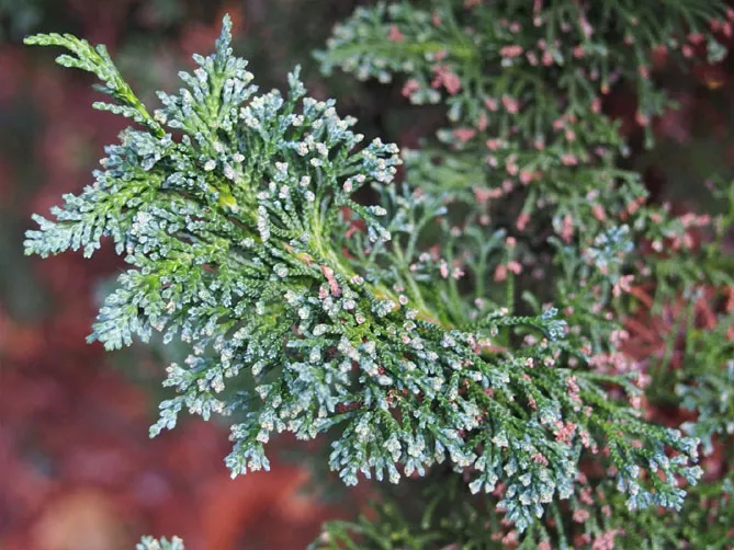 - Листя. Кипарисовик відрізняються від інших хвойних рослин головним чином зовнішнім виглядом листя. Їх зелені лусочкові листя вкриті блакитнуватим або сріблястим восковим нальотом і мають чіткий яскравий У-подібний візерунок на нижній стороні. Лускоподібне листя щільно прилягає до пагона, часто перекривають одне одного, тому майже повністю закривають гілочки.