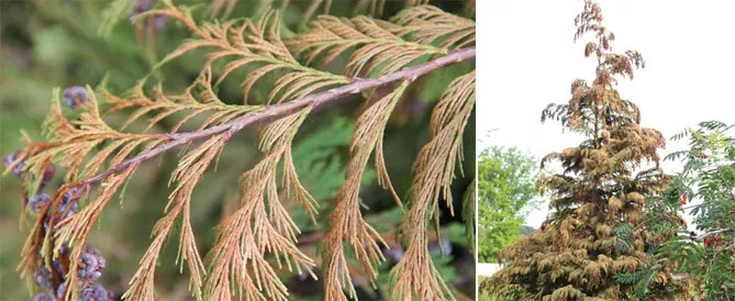 - Відмирання пагонів – захворювання, що призводить до пожовтіння, потемніння, опадання хвої. Для боротьби з хворобою підійдуть препарати – Топсін, Світч, Сігнум.