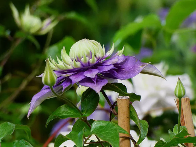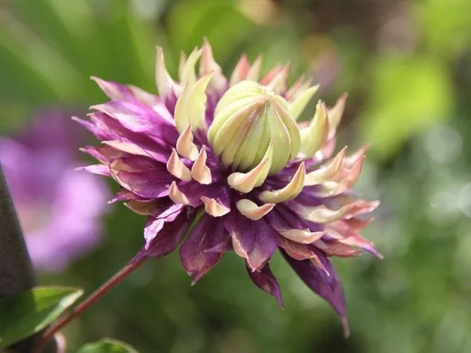 Цей клематис – справжній твір мистецтва, він дійсно унікальний. Цвіте з літа до осені великими, махровими квітками. Брунька розкривається поступово, у вигляді вигнутих пурпурно-блакитних пелюсток, що закінчуються зеленими кінчиками. Різнобарвність квітів переходить у лілові та рожевувато-кремово-білі тони. Скромна за висотою, ця ліана з надзвичайною витонченістю тішитиме око в саду та в горщиках. Дізнайтеся, як проводити посадку, вирощування та догляд за клематисом Тайга, подивіться фото та опис цієї красивої ліани.