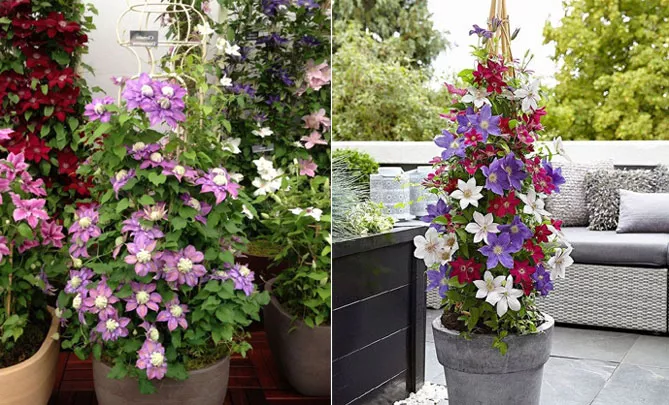 Клематиси відмінно ростуть в контейнерах, горщиках. Це відмінний спосіб краще захистити їх від холоду. Вирощування в горщиках не особливо складне. Клематис в горщиках буде трохи меншим, ніж той, що росте в землі. Він не зможе створити велику кореневу систему, однак в контейнерах легше забезпечити належні водні умови та вносити необхідну дозу добрива. Рослинам потрібні великі горщики – оптимально більше 30 см в діаметрі та 40 см у висоту. На дно горщика потрібно насипати дренаж, наприклад, трохи керамзиту, щоб коріння рослини не стояло у воді.