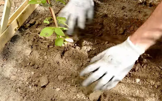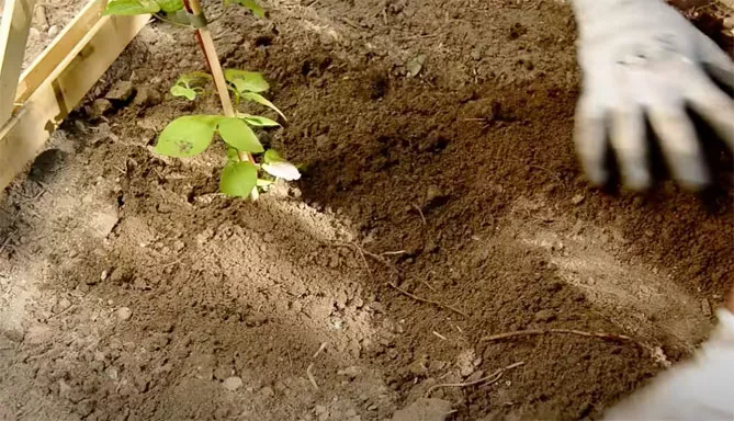 Після розміщення в ямі рослини засипаємо садовою землею, змішаною навпіл з компостом. Саджанці розміщують у ямі на кілька сантиметрів глибше, ніж вони росли в горщику. Присипані пагони випустять коріння, що зміцнить рослину.