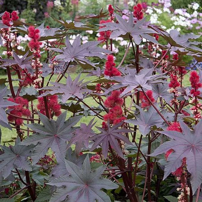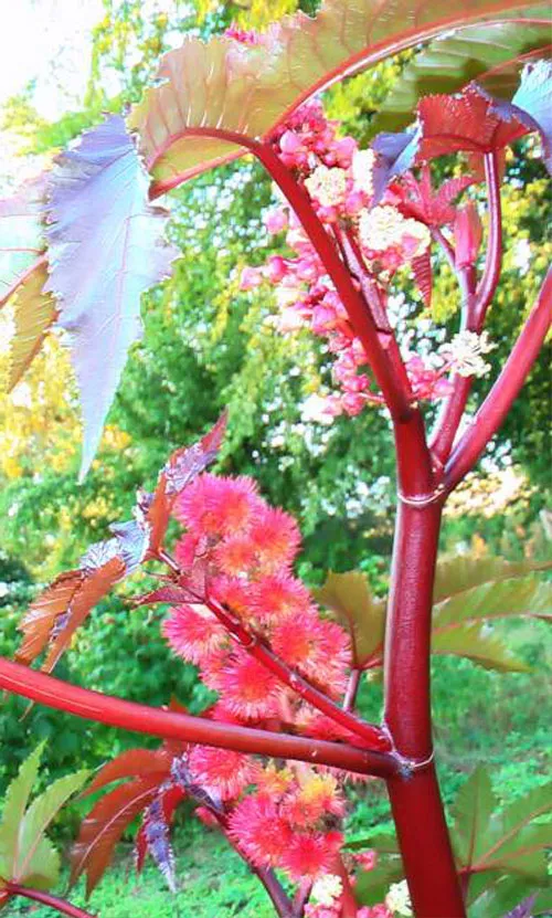Сорти клещевини різняться за зростом і кольором листя та квітів: