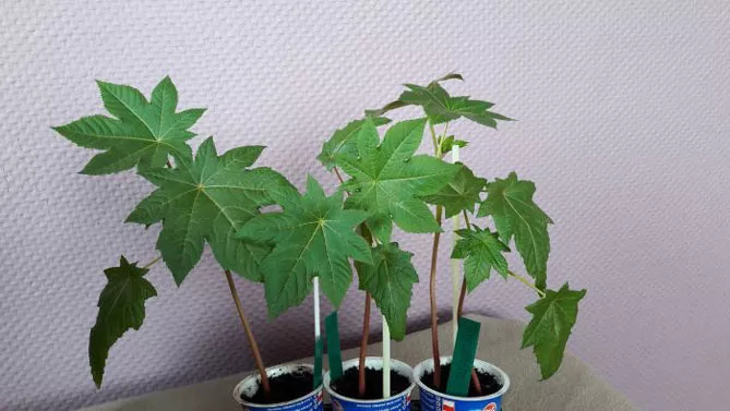 Порада. Проростання насіння клещевини дуже нерівномірне, різниця між першими і останніми може сягати місяця. Щоб покращити рівномірність проростання, потріть тверду шкірку насінин між двома шматочками дрібної наждачного паперу, а потім замочіть як мінімум на ніч.