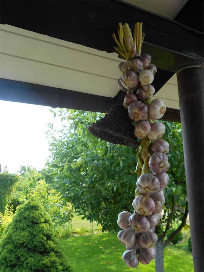 Краще зберігати урожай в сухому темному приміщенні. Ідеальний контейнер – кошик або ящик, що дозволяє повітрю вільно циркулювати. Можна також підвісити урожай під стелю, заплітаючи стебла в косичку або зв'язавши пучками.