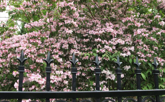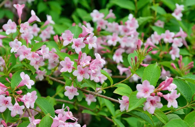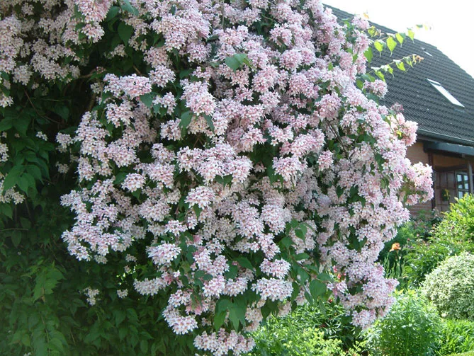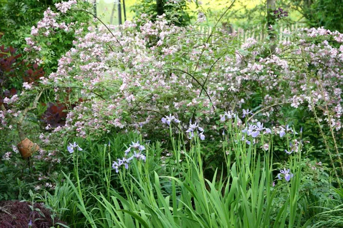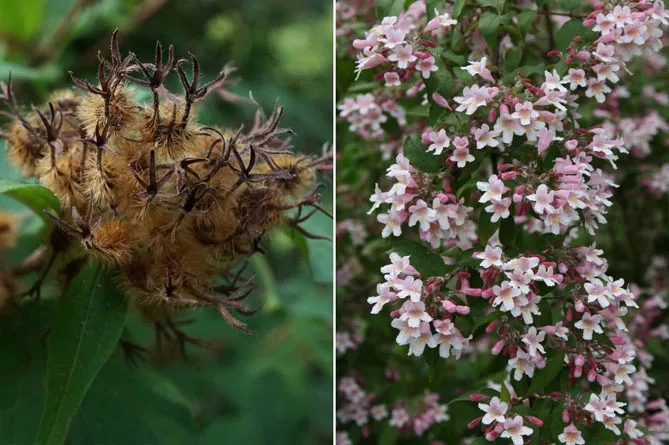 Стройний силует кольквіції чудово поєднується з більш компактними та невисокими кущами: