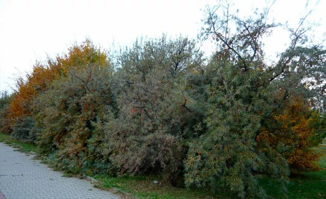 Ще один колючий садовий кущ – обліпиха. Рослина досягає кількох метрів у висоту, має вузьке сріблясте листя. Обліпиху прикрашають її плоди. В кінці літа – на початку осені кущ обсипається помаранчевими плодами, які буквально обліплюють його гілки, звідси й назва – обліпиха. Плоди обліпихи використовуються в кулінарії, є цінним джерелом багатьох вітамінів, мінералів. Господарки використовують їх для приготування смачних консервів, соусів до м'яса.