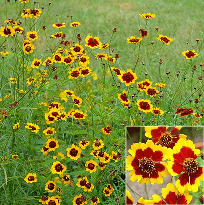 - Кореопсис Фарбувальний (Coreopsis tinctoria) – однорічна рослина має двоколірну квітку, росте до 40 см, утворює щільні кущики, період цвітіння – ближче до кінця літа. Віддає перевагу сонячним позиціям. Має невеликі перисті листя, дуже декоративні жовті квіти з широким фіолетово-бордовим центром. Включає низькорослі сорти, які можна вирощувати в горщику на балконі, і високі, ідеально підходящі для багаторічних рабаток. Підходять для зрізаної квітки.