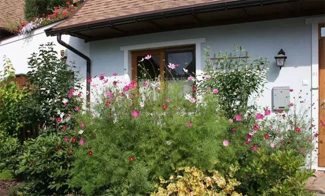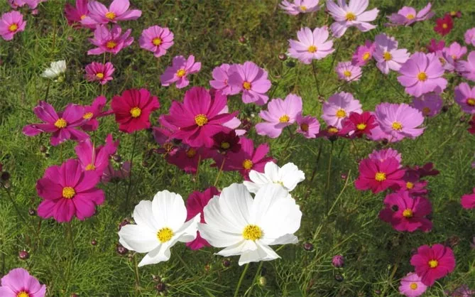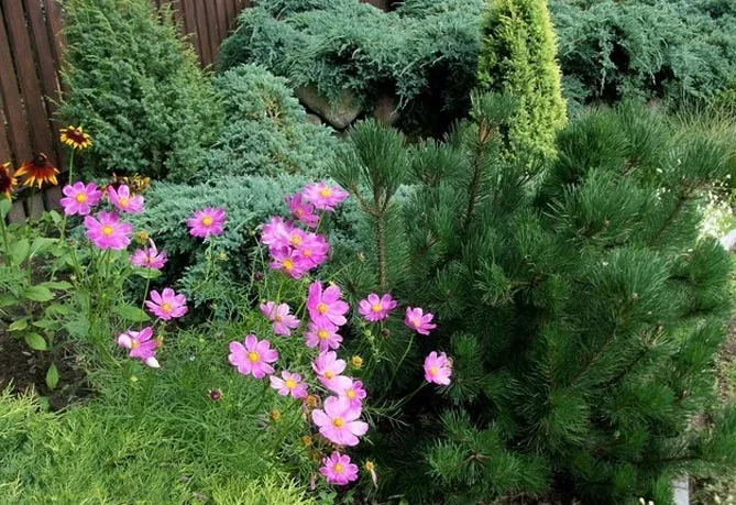 Клумба з космеєю виглядає як зелене небо густо всипане рожевими і білими зірками квітів. Оптимальні умови для розвитку – сонячні позиції і проникні ґрунти.