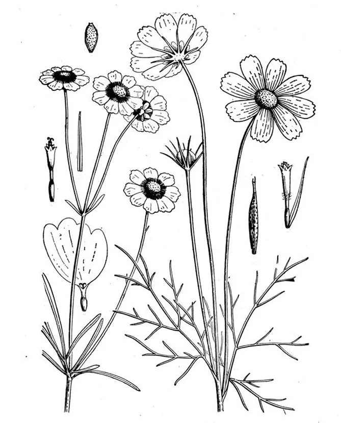 Космеї пишно розцвітають величними, плоскими, відкритими, різнобарвними кошиками. І листя, і квіти є декоративним доповненням літніх, сільських букетів.