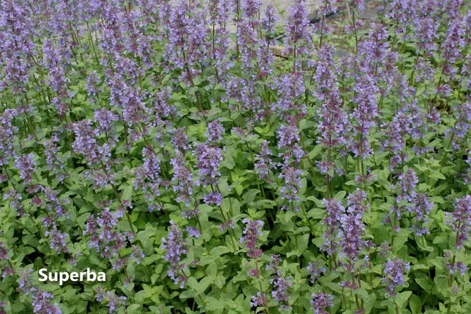 - Сорт «Superba» є рекомендованим. «Суперба» створений в 1804 році, вважається одним з найкрасивіших і сильних сортів серед низькорослих котячих м'ят на сьогоднішній день. З кінця квітня до початку липня «Суперба» прикрашає сад бузково-блакитним цвітучим килимом. Якщо рослину обрізати вчасно, воно буде цвісти до осені.