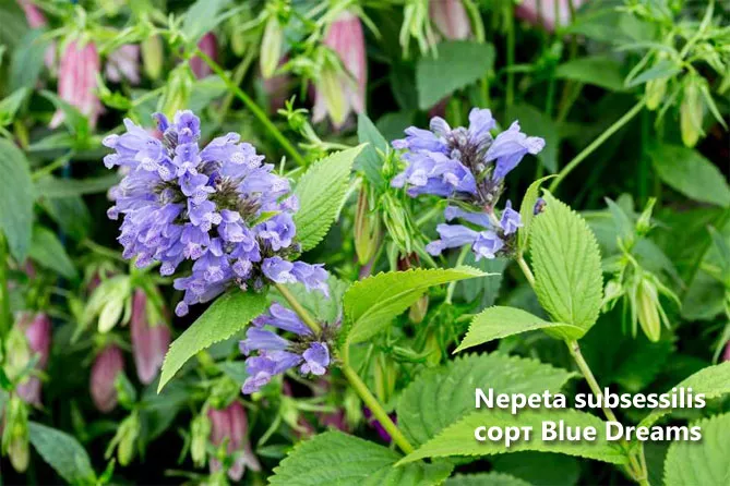 - Котяча м'ята напівсидяча (Nepeta subsessilis), родом з Японії, зачаровує відносно великими квітами.