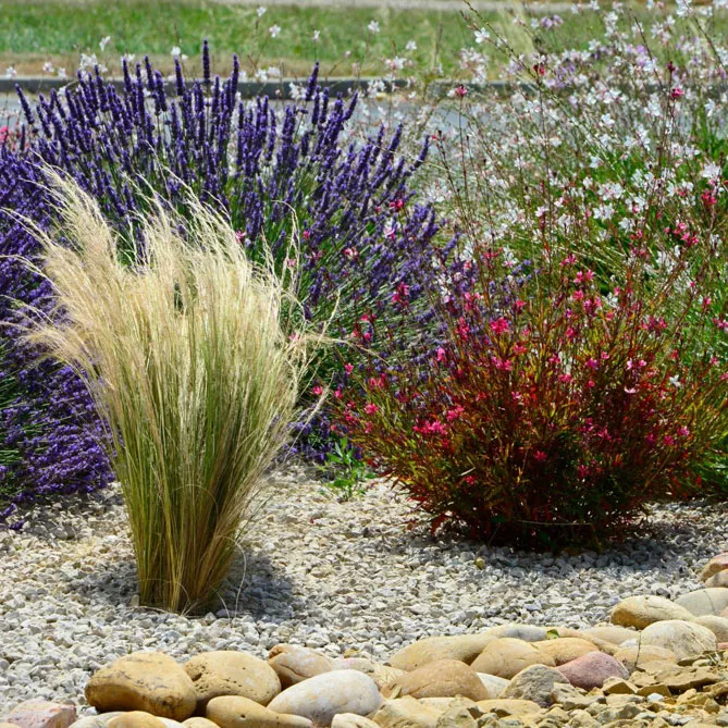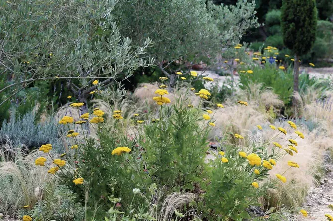 Фото. Приклад саду в середземноморському стилі: ковила тончайша, деревій таволголистий, лаванда
