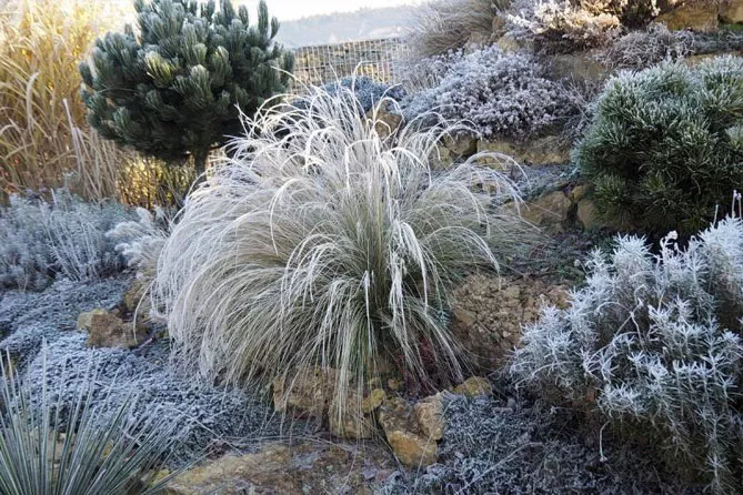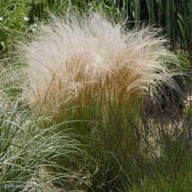Дуже ефектна маленька трава – ковила пірчаста (лат. Stipa pennata) підходить для посадки на краю тераси або в горщику. Період цвітіння: червень-жовтень. Висота – 40 см. Її сріблясті насіннєві голівки ефектні і дуже поетично розвіваються на вітрі.