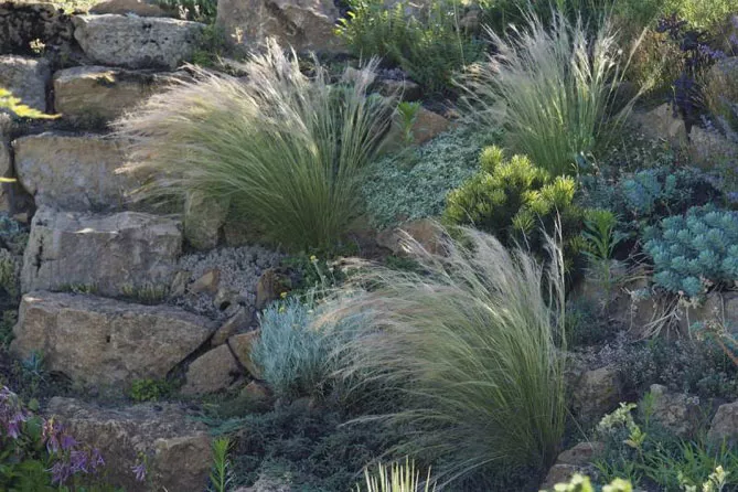 Ковила прикрасить своєю повітряною присутністю кам'янисті сади, оточена іншими травами: