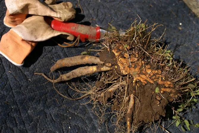 - Знайдіть дуже щільний кущик, викопайте його з землі за допомогою лопати. Можна видалити зайву землю навколо коренів.