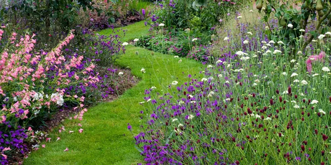 Фото. Барвисті бордюри в саду з кровохльобками, вербенами, скабіозами