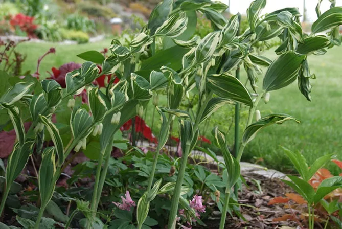 - Polygonatum falcatum «Вариегатум» Variegatum – рослина, що використовується для паркових посадок та тінистих ділянок садів. Характеризується білими декоративними облямівками кінчиків листків та вигнутими серпоподібно-червонувато-коричневими стеблами.