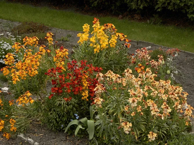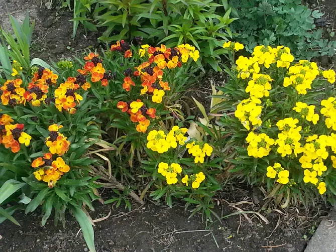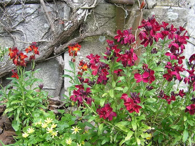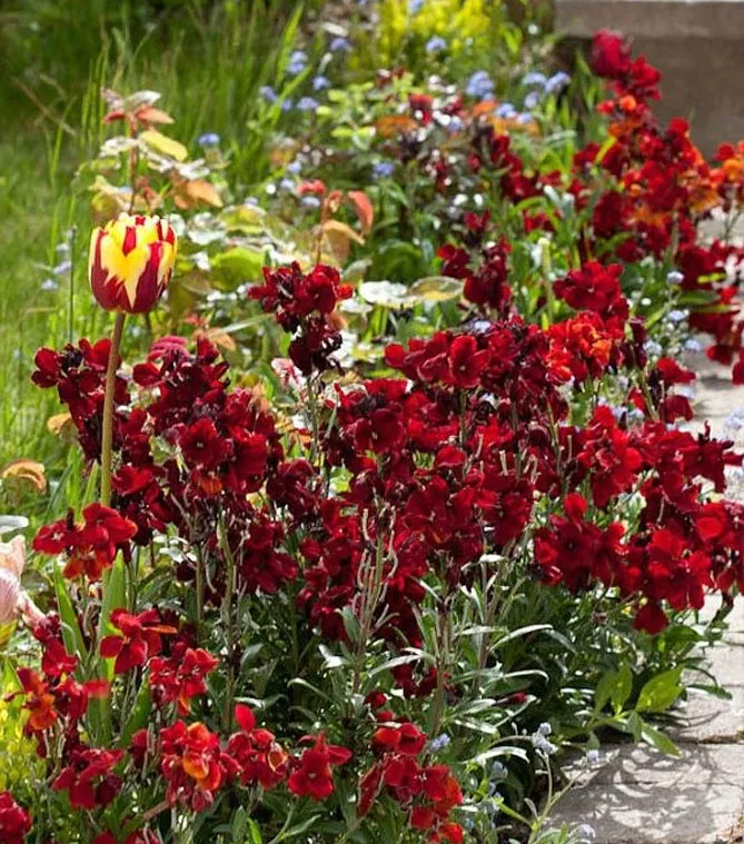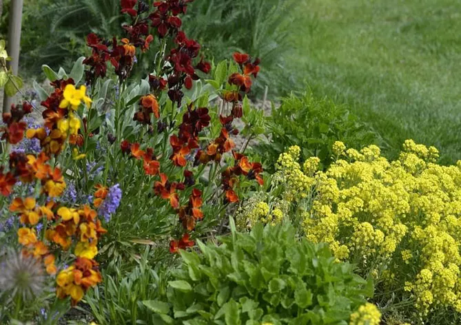Лакфіоль чудово виглядає в компанії з декоративними чагарниками і весняноквітучими цибулинними рослинами: