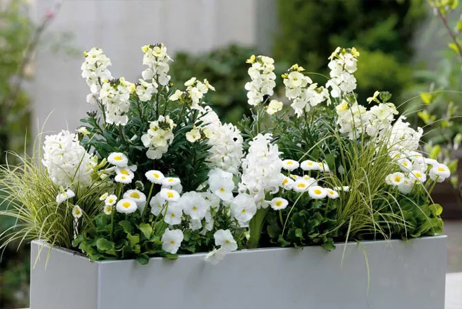 Фото. Приклад комбінації лакфіолі в горщику з гіацинтами, братками, маргаритками