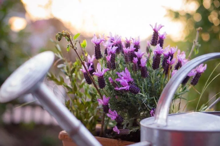 Лаванда, що вирощується в контейнерах, горщиках на балконах, терасах, більш вимоглива до поливу, ніж, культивована в відкритому грунті. Необхідний систематичний, але помірний полив, залежно від погодних умов – 1-2 рази на тиждень. Воду підливають у невеликих кількостях тільки коли грунт висох. Однак не дозволяйте грунту висохнути надмірно, затвердіти. Поверхня грунту може бути вкрита декоративним гравійним або дрібнозернистим наповнювачем, що обмежує надмірне висихання субстрату в спекотні, сонячні літні дні.