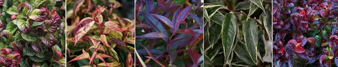 Фото. Листва Leucothoe дуже декоративна, сорти: L. axillaris ‘Curly Red’, L. fontanesiana ‘Makijaz’, L. keiskei ‘Burning Love’, L. fontanesiana ‘Whitewater’, L. ‘Twisting Red’.