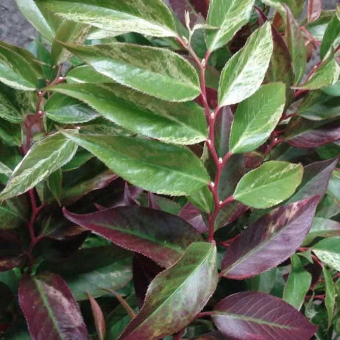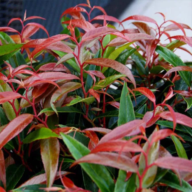 Листя розташоване на короткому черешку, ланцетне, завдовжки 7 см і 2 см шириною, цільнокрає, загострене, товсте, шкірясте, верхня поверхня глянцева, нижня матова. Навесні молоді листки стають винно-червоними та кармінними, до літа набувають свіжих, насичених зелених тонів, восени переходять до теплих відтінків бордового та коричневого.