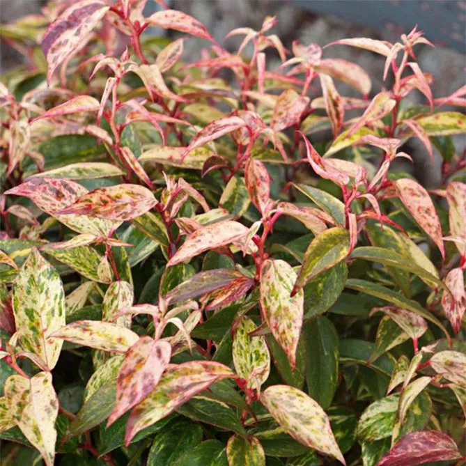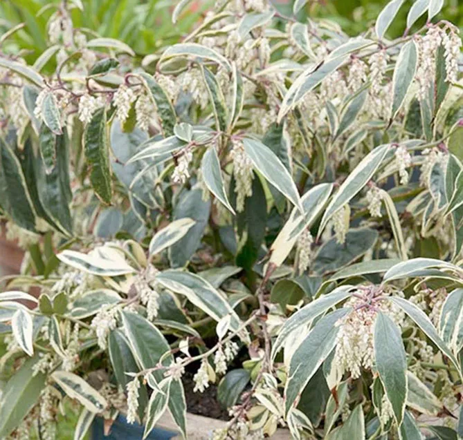 Леукотое Дефонтена «Макіяж» (Leucothoe fontanesiana Makijaz) цвіте навесні (квітень-травень), кущ мініатюрний, висота – 40 см. Ексклюзивний сорт зі строкатим листям, що змінює колір залежно від пори року. Чудово вписується у орнамент затінених терас, балконів.