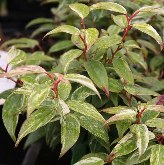 Листя щедро прикрашає гілочки, розташоване в пряму лінію на коротких черешках, має довжину до 8 см, шкірясте, вузьке, яйцеподібної форми, з гострим подовженим кінчиком. До кінця теплих літніх днів листя світло-зелене, оточене червонуватими краями. З настанням осінніх холодів з'являються численні плями бордового кольору, що поступово покривають все листя. Взимку захоплює поєднання винно-червоного, бордового та кармінового відтінків, що покривають весь кущ. Цвіте близько 4 тижнів у травні – червні. Білі квітки мають форму тонких дзвіночків завдовжки 1,5 см, зібраних у суцвіття по кілька сантиметрів, що звисають із пазух листя.