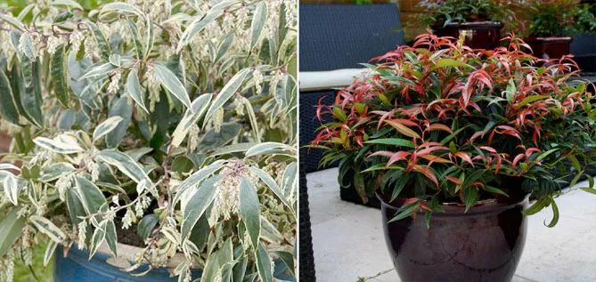 Фото. Леукотое добре підходить для вирощування у горщиках: L. keiskei ‘Burning Love’, L. fontanesiana ‘Whitewater’