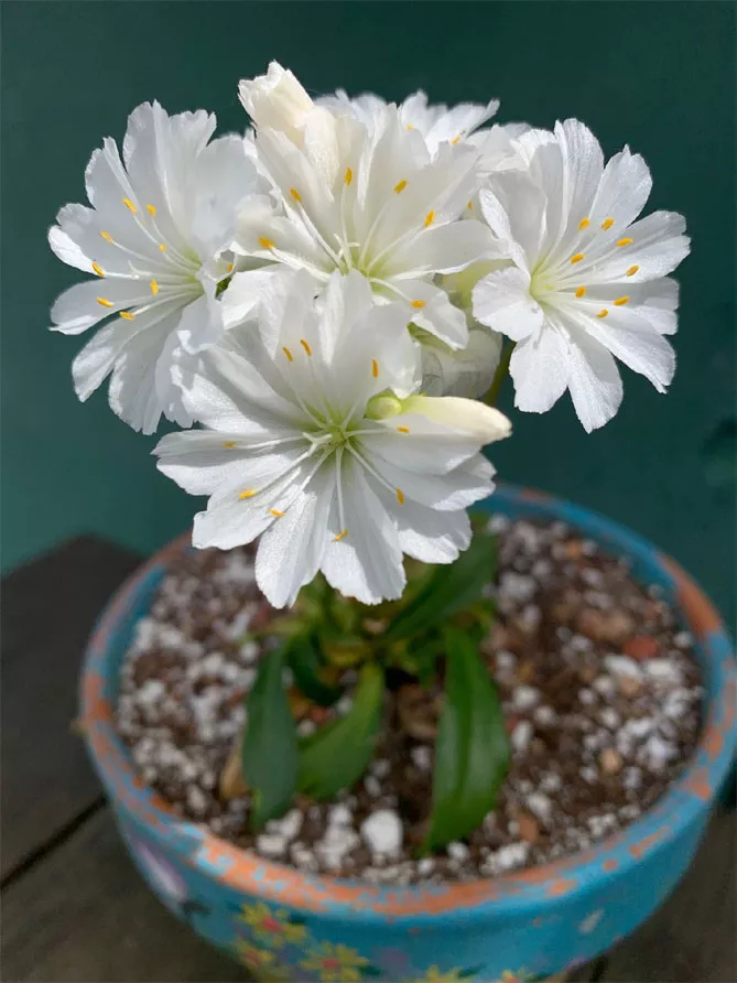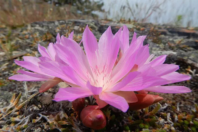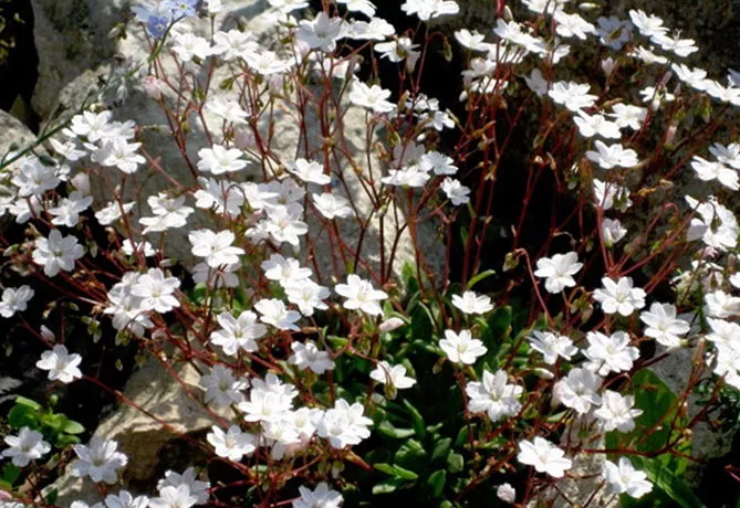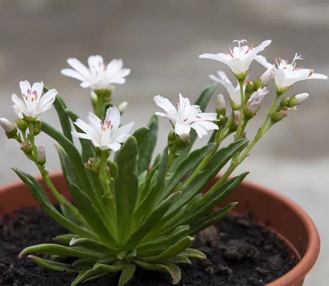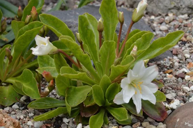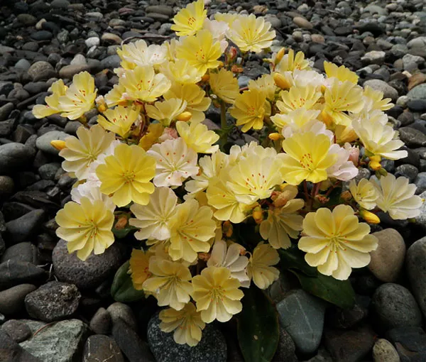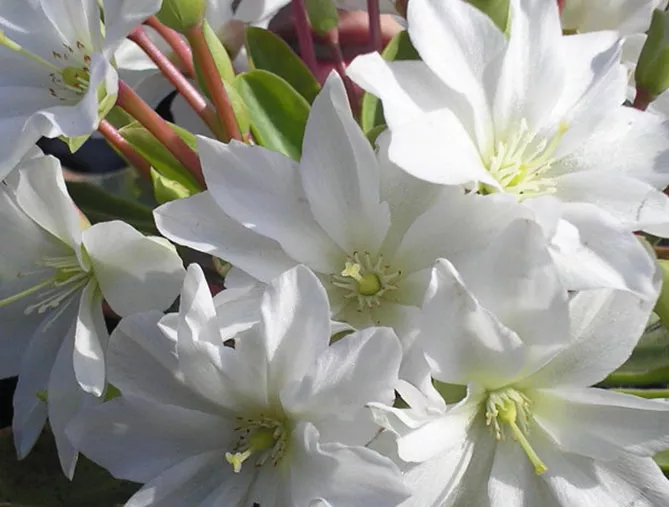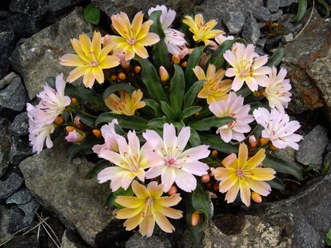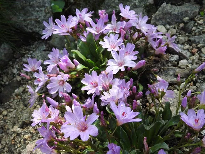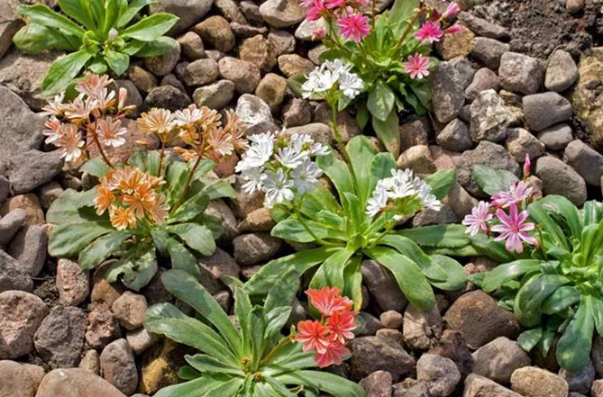 Левізія колумбіана або колумбійська (Lewisia columbiana) може похвалитися найдовшими квітковими пагонами, що згинаються в сторони під вагою безлічі білих квітів. Цвітіння починається в травні, триває в червні.